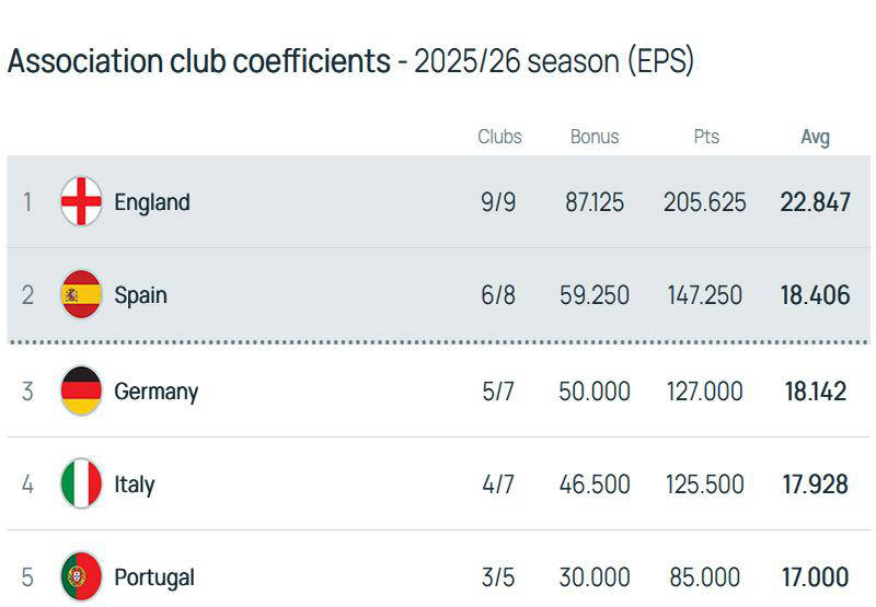 根据欧足联最新积分榜显示,虽然英超整体状态低迷,但其在单赛季积分排行中仍稳居首位。英超领先优势虽从联赛末尾时的5分缩水至4.4分,但即便所有9支球队全部出局,英超失去第一位置的概率依然极低,更遑论同时被两大联赛超越。由此,英超基本锁定了前两名的位置,确保继续拥有欧冠多项奖励。此外,下赛季英超第五名依旧享有欧冠参赛资格,预计曼联、阿斯顿维拉、利物浦和切尔西四支球队将为三个欧冠席位展开激烈竞争。